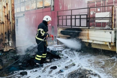Hatay'ın Antakya ilçesinde bir kamyonette başlayan yangın, malzeme dolu konteynıra sıçrarken itfaiye ekipleri yangını söndürdü.