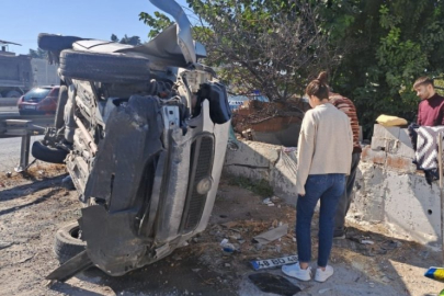 Aydın'ın Söke ilçesinde kontrolden çıkarak yan yatan bir araç, önce bariyerlere çarptı ardından yol kenarındaki bir evin duvarına çarparak durabildi.