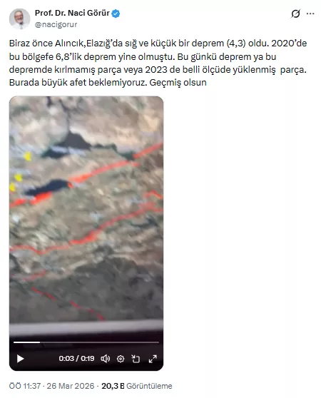 Kırılmanın gerçekleşmiş olabileceği fayları ve bölgedeki deprem potansiyele dikkat çeken Prof. Dr. Naci Görür, "Biraz önce Alıncık,Elazığ'da sığ ve küçük bir deprem (4,3) oldu. 2020'de bu bölgefe 6,8'lik deprem yine olmuştu. Bugünkü deprem ya bu depremde kırlmamış parça veya 2023 de belli ölçüde yüklenmiş parça. Burada büyük afet beklemiyoruz. Geçmiş olsun" ifadelerini kullandı.