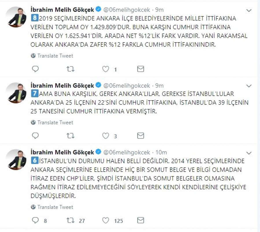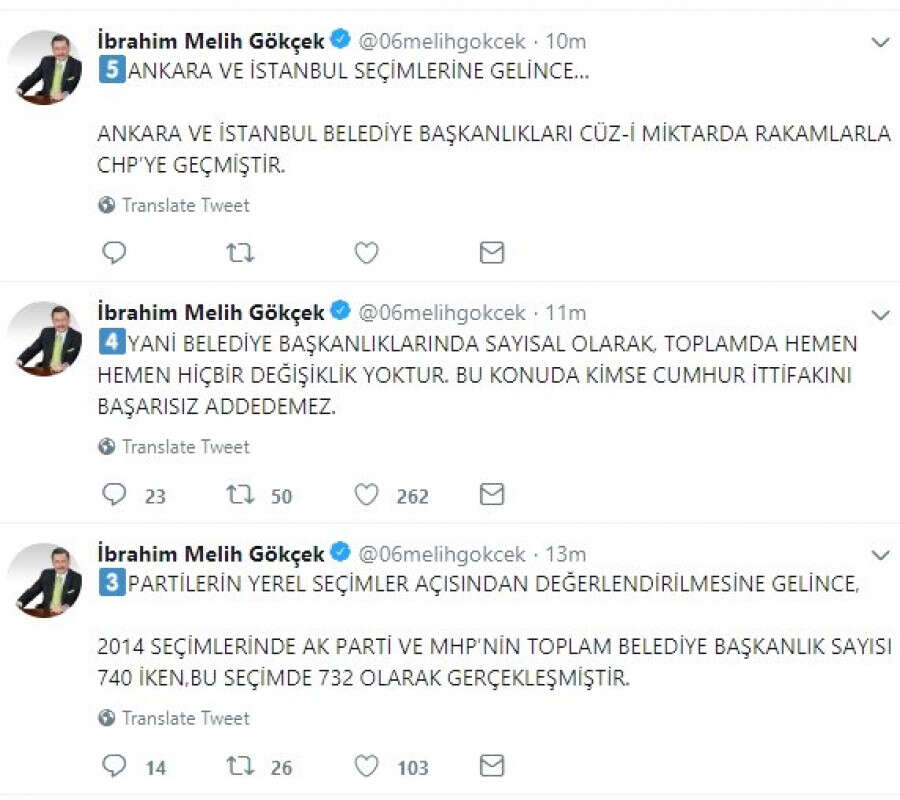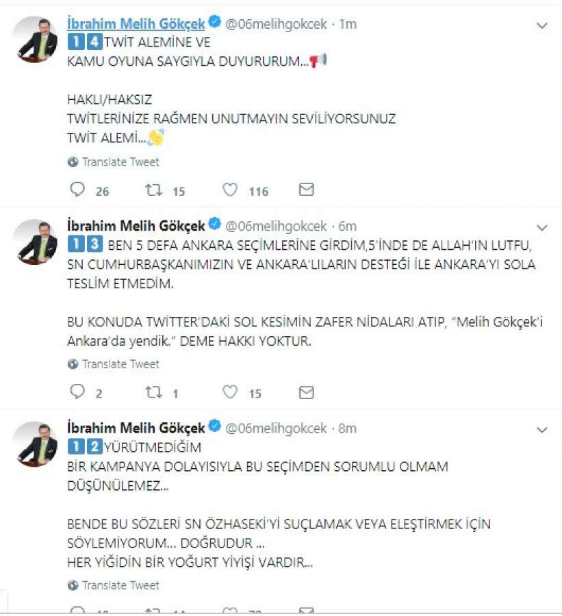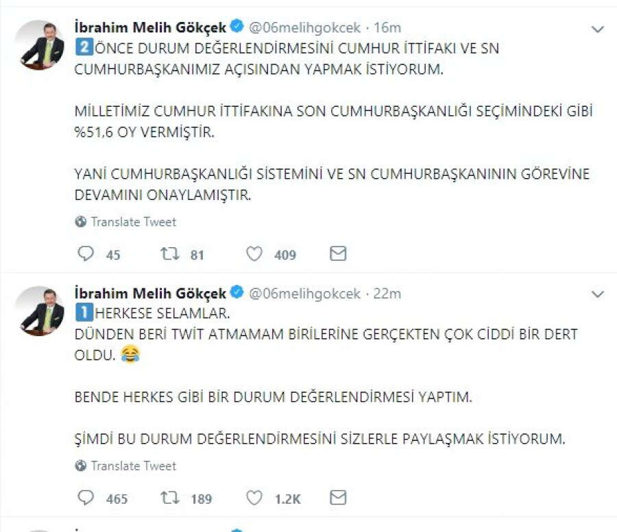 Eski Ankara Büyükşehir Belediye Başkanı Melih Gökçek, seçim sonuçlarının ardından uzun süre sessiz kaldığı Twitter'a geri döndü.