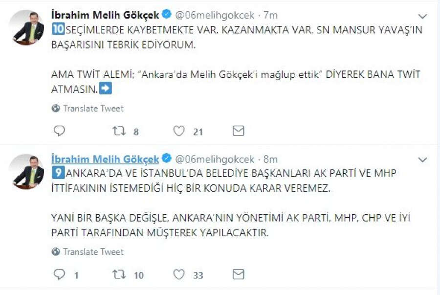 Ankara seçimlerini Mansur Yavaş'ın kazanmasının ardından sosyal medya paylaşımlarına ara veren Melih Gökçek, yaklaşık 40 saat sonra sosyal medyaya geri döndü ve seçim değerlendirmesi yaptı.