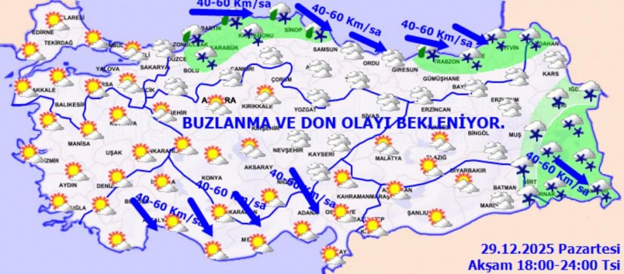 Kuzey, iç ve doğu kesimlerde buzlanma ve don olayı beklendiğinden yaşanabilecek olumsuzluklara karşı dikkatli ve tedbirli olunması gerekmektedir.