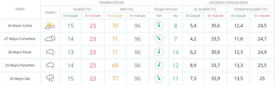Meteoroloji Genel Müdürlüğü tarafından yapılan son değerlendirmelere göre: Ülkemiz genelinin parçalı ve çok bulutlu, Trakya, Ege, Göller Yöresi, İç Anadolu, Batı ve Orta Karadeniz'in iç kesimleri, Doğu Karadeniz, Doğu Anadolu, Güneydoğu Anadolu'nun doğusu ile Bilecik ve Ordu çevrelerinin aralıklı sağanak ve gök gürültülü sağanak yağışlı geçeceği tahmin ediliyor. Yağışların; İç Ege, İç Anadolu'nun kuzeybatısı, Doğu Karadeniz'in iç kesimleri ile Aksaray, Nevşehir, Yozgat, Erzurum, Kars, Bingöl, Muş ve Bitlis çevrelerinde yerel kuvvetli olması bekleniyor.