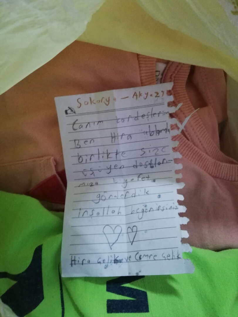 Sakarya'da Akyazı Belediyesi tarafından depremzedeler için başlatılan yardım kampanyasına 7'den 7'e herkes katıldı. Kampanyaya kumbara ve kıyafetlerini bağışlayan iki çocuğun, "Size, üşüyen dostlarımıza kıyafet gönderdik. İnşallah beğenirsiniz" yazılı notu ise herkesi duygulandırdı.
