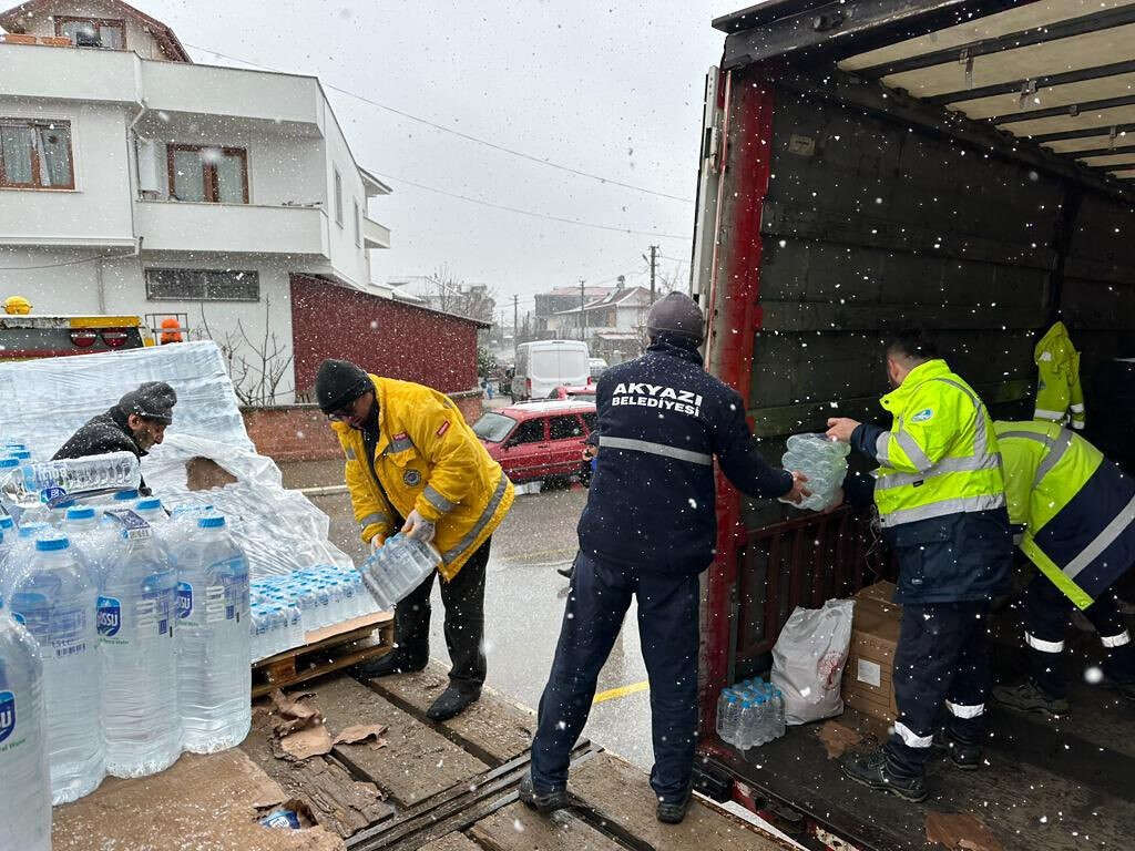 Akyazı Belediyesi olarak bölgeye 23 ve 30 tonluk iki ekskavatör, 2 şoför ve 2 çekici tır gönderdiklerini belirten Soykan, "Vatandaşlarımızın, muhtarlarımızın, esnafımızın ve sanayicilerimizin destekleriyle 2 tır su, 10 ton kuru bakliyat, bin 88 elektrikli ısıtıcı, 8 ton un, 100 paket gıda, 3 bin 40 battaniye, bin 30 yorgan ve yastık, 4 bin ekmek, 2 ton peynir, bin 500 paket çocuk bezi, bin 80 mont, bin 400 çift ayakkabı, bir ton zeytin, bin kazak ile tonlarca yaşam malzemesini depremzedelerimiz için bölgeye gönderdik. Yardım toplama çalışmalarımız aynı şekilde devam edecek. Vatandaşlarımızdan özellikle kullanılmamış eşyaları getirmelerini önemle rica ediyorum" diye konuştu.