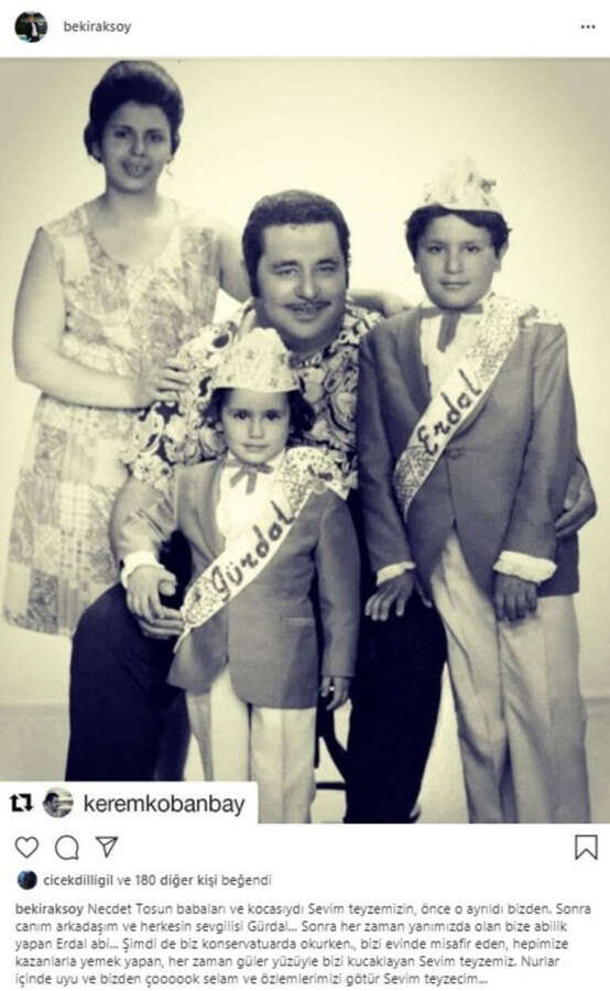 "Necdet Tosun babaları ve kocasıydı Sevim Teyze'mizin... Önce o ayrıldı bizden! Sonra canım arkadaşım ve herkesin sevgilisi Gürdal... Sonra her zaman yanımızda olan bize abilik yapan Erdal Abi... Şimdi de biz konservatuarda okurken bizi evinde misafir eden; hepimize kazanlarla yemek yapan, her zaman güler yüzüyle bizi kucaklayan Sevim teyzemiz. Nurlar içinde uyu ve bizden çoooook selam ve özlemlerimizi götür Sevim teyzecim..."