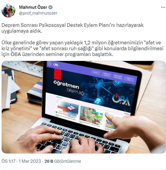 Bakan Özer, Twitter hesabından yaptığı açıklamada, "Deprem Sonrası 'Psikososyal Destek Eylem Planı'nı hazırlayarak uygulamaya aldık. Ülke genelinde görev yapan yaklaşık 1,2 milyon öğretmenimizin 'afet ve kriz yönetimi' ve 'afet sonrası ruh sağlığı' gibi konularda bilgilendirilmesi için ÖBA üzerinden seminer programları başlattık" dedi.