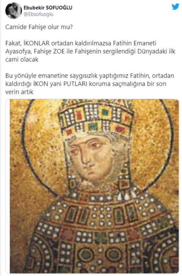 Sakarya Üniversitesi'nde görevli Prof. Dr. Ebubekir Sofuoğlu, Ayasofya'daki kutsal eserlerin sökülmesini istedi. İmparatoriçe Zoe için 'Fahişe' diyen Sofuoğlu, sosyal medya hesabından yaptığı paylaşımdı şu ifadeleri kullandı: