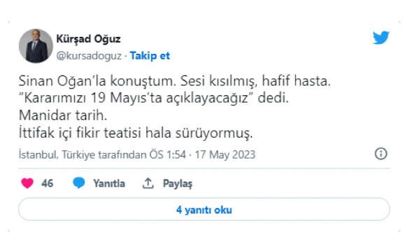 Aldığı oy oranı seçimde kritik bir rol oynayan ATA İttifakı Cumhurbaşkanı adayı Sinan Oğan'ın Cumhur ittifakını mı yoksa Millet İttifakını mı destekleyeceği merak edilirken gazeteci Kürşat Oğuz sosyal medya hesabından konuya ilişkin dikkat çeken bir paylaşımda bulundu.