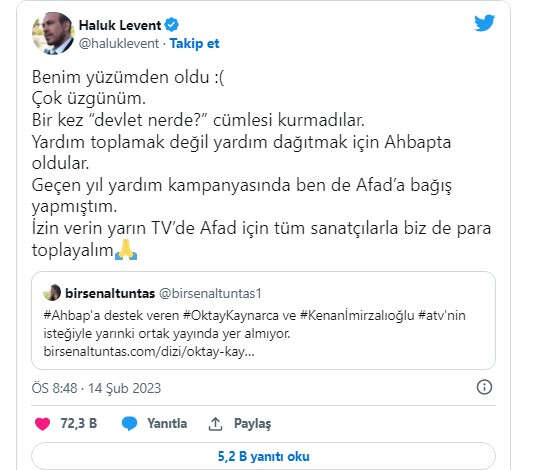 Yaşanan gelişmenin ardından sosyal medya hesabı üzerinden açıklama yapan Haluk Levent, ''Benim yüzümden oldu. Çok üzgünüm'' dedi.