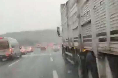 Arnavutköy'de kar yağışının başladığı esnada önünde oluşan trafikten kurtulmak için ani şerit değiştiren bir otomobile, seyir halinde olan kamyonet çarptı. Kaza anı cep telefonu kamerasıyla görüntülendi.