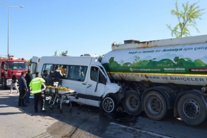 Antalya'nın Serik ilçesinde, belediyeye ait sulama tankerine arkadan çarpan tur minibüsünün sürücüsü Mehmet Deniz ile araçtaki 1'i çocuk 5 turist yaralandı.