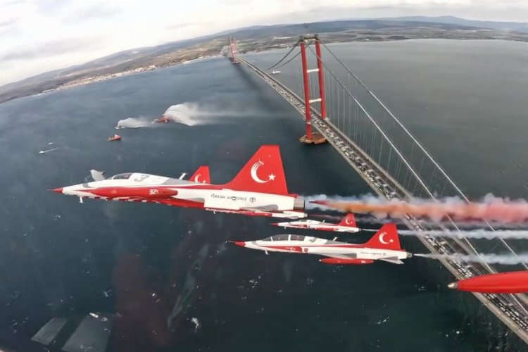 Türk Hava Kuvvetlerinin akrobasi timi Türk Yıldızları, Çanakkale Boğazı'nın gerdanlığı" olarak nitelendirilen 1915 Çanakkale Köprüsü'nün açılış töreninin ardından gösteri uçuşu gerçekleştirdi.