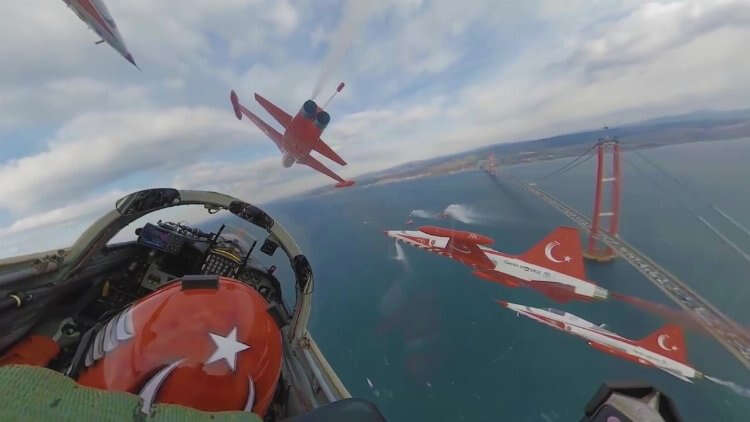 6'lı kol düzeninde gerçekleştirilen gösteri uçuşunda kırmızı beyaz renklerdeki 1915 Çanakkale Köprüsü ile aynı renkleri gövdesinde taşıyan Türk Yıldızları'nın renk ahengi kokpit içi kameralara yansıdı.