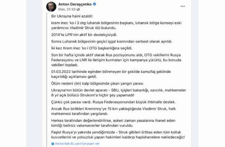 Rusya-Ukrayna savaşında Rusya'yı destekleyen Ukraynalı Belediye Başkanı Volodymyr Struk ölü bulundu. Kaçırıldıktan sonra başından vurularak yol kenarına bırakılan Struk'un infaz edildiği iddia ediliyor.