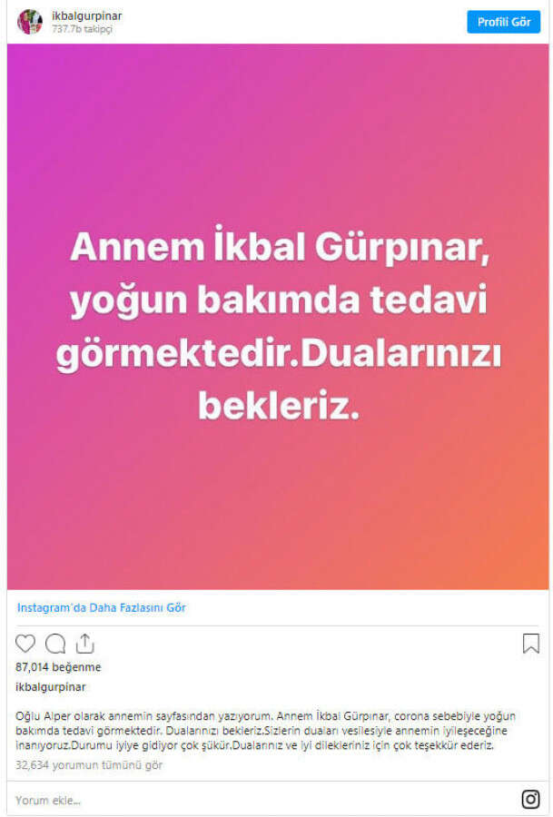İkbal Gürpınar'ın sosyal medya hesabı üzerinden yapılan açıklamada, "Oğlu Alper olarak annemin sayfasından yazıyorum. Annem İkbal Gürpınar, corona sebebiyle yoğun bakımda tedavi görmektedir. Dualarınızı bekleriz." dedi.