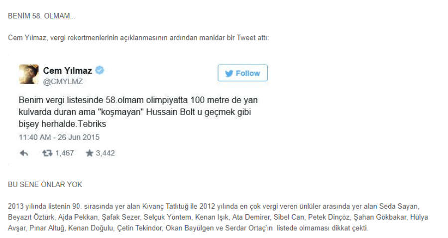 Cem Yılmaz 2016 listesinde 4 milyon 712 bin 274 lira ile 89. sırada yer alırken 2017 yılında ilk 100 listesinde ismi yer almadı.