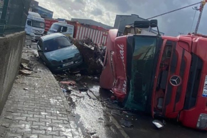Virajı alamayan tır park halindeki araçların üstüne devrildi