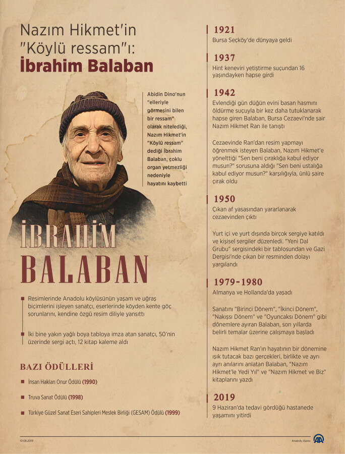 Abidin Dino'nun 'elleriyle görmesini bilen bir ressam' olarak nitelediği, Nazım Hikmet'in 'Köylü ressam' dediği İbrahim Balaban yarın Bursa'da son yolculuğuna uğurlanacak