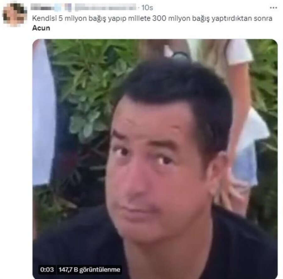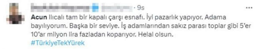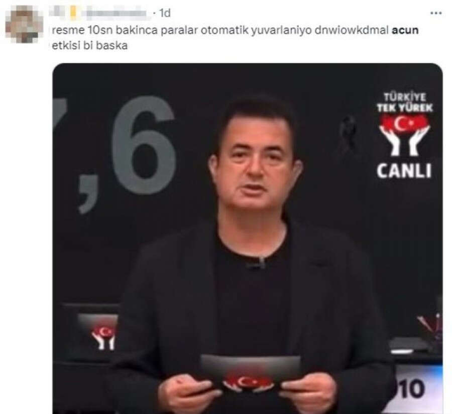 Depremzedeler için düzenlenen Türkiye Tek Yürek kampanyasında sunuculuk yapan Acun Ilıcalı'nın gelen bağış miktarını "Bunu yuvarlayalım" diyerek artırması sosyal medyada gündem oldu. 20 milyonluk bağışı artırarak 30 milyon yaptıran Ilıcalı'nın ekranda olduğu süre boyuncu ekstra 75 milyon topladığı ileri sürüldü.