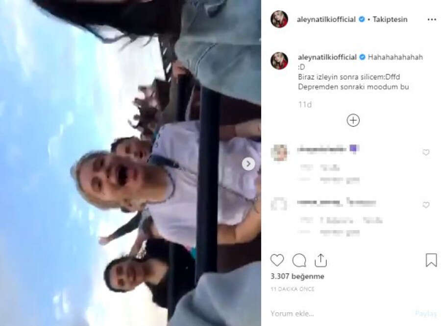 19 yaşındaki Aleyna Tilki, yüreklerin ağza geldiği deprem sonrası 2,5 milyon takipçisinin bulunduğu Instagram hesabından korku treni olarak bilinen oyuncağa bindiği anların videosunu paylaştı. Çığlık attığı videosunu kahkaha emojileriyle paylaşan Tilki, "Biraz izleyin sonra sileceğim. Depremden sonraki modum bu" notunu yazdı.