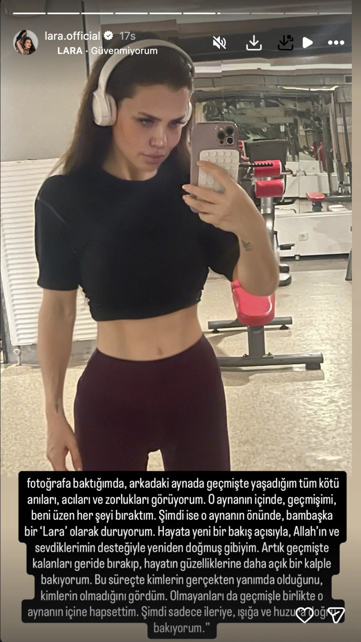 Spor salonundan paylaşım yapan Lara, şu ifadeleri kullandı: "Fotoğrafa baktığımda arkadaki aynada geçmişte yaşadığım tüm kötü anıları, acıları ve zorlukları görüyorum. O aynanın içinde geçmişimi, beni üzen her şeyi bıraktım. Şimdi ise aynanın önünde bambaşka bir 'Lara' olarak duruyorum.