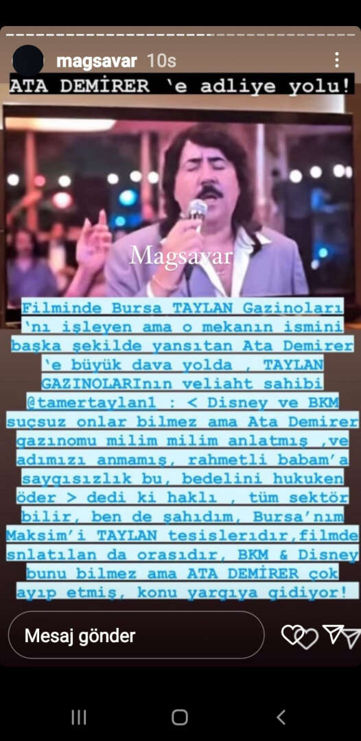 Bursa TAYLAN Gazinoları'nın veliaht sahibi Tamer Taylan, Ata Demirer'in Bursa Bülbülü filmi hakkında yaptığı açıklamada; "Disney ve BKM suçsuz onlar bilmez ama Ata Demirer gazinomu milim milim anlatmış ve adımızı anmamış. Rahmetli babama saygısızlık bu, bedelini hukuken öder." dedi