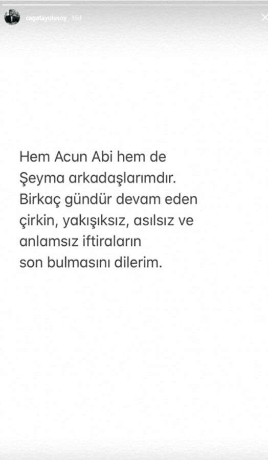 Sessizliğini koruyan Çağatay Ulusoy, sosyal medya üzerinden iddiaları yalanlayan açıklama yaptı. Ulusoy, "Hem Acun abi, hem de Şeyma arkadaşımdır. Birkaç gündür devam eden çirkin iftiraların son bulmasını dilerim" dedi.