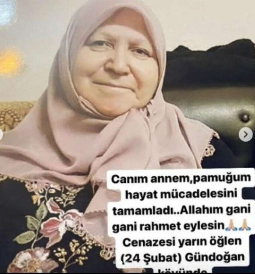 Oyuncu, "Canım annem, pamuğum hayat mücadelesini tamamladı. Allah'ım gani gani rahmet eylesin. Cenazesi yarın öğlen (24 Şubat) Gündoğan köyünde defnedilecektir" bilgisini paylaştı.