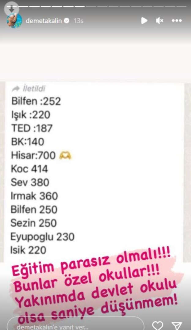 Şarkıcı Demet Akalın, özel okul fiyatlarına gelen yüzde 65'lik zamma isyan etti. Sosyal medya hesabından eğitimin parasız olması gerektiğini söyleyen Akalın, "Yakınımda devlet okulu olsa saniye düşünmem. Kitaplar bedava olsun. Yemin ediyorum harcanıyorum milletvekili olmam lazım" ifadelerini kullandı.