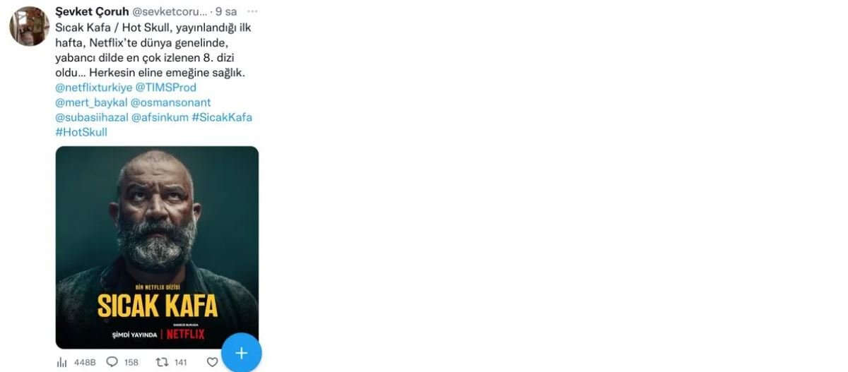 Sosyal medya hesabından bir paylaşımda bulunan Şevket Çoruh, "Sıcak Kafa/Hot Skull” dizisinin yayınlandığı ilk haftada, Netflix’in tüm dünyadaki aboneleri arasında, yabancı dilde en çok izlenen 8. dizi olduğunu söyledi.
