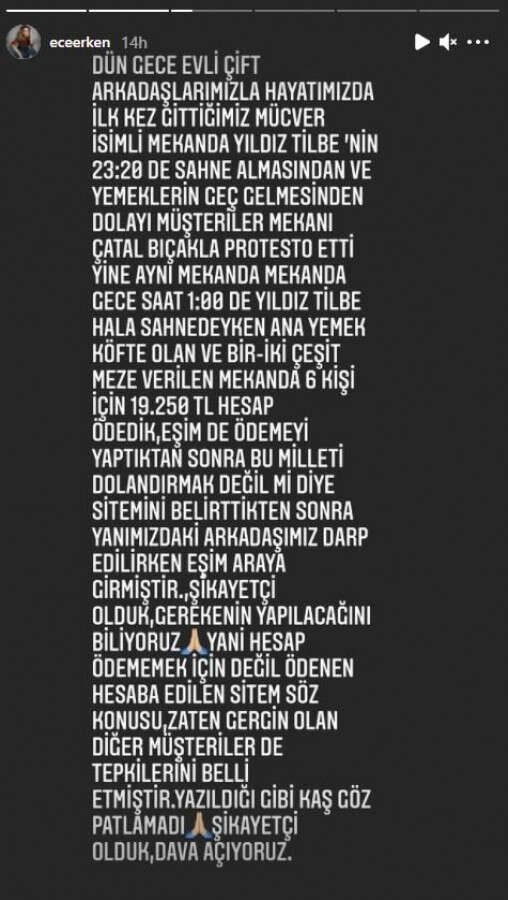 Sunucu Ece Erken, eşi Şafak Mahmutyazıcıoğlu ile Yıldız Tilbe'nin sahne aldığı bir mekanda yemek yedikten sonra gelen 19 bin 250 TL'lik hesaba sitem etti. Erken, "Eşim ödemeyi yaptıktan sonra 'Bu milleti dolandırmak değil mi' diye sitemini belirttikten sonra yanımızdaki arkadaşımız darbedilirken eşim araya girmiştir.