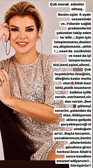 Nasıl da naziksiniz ve nasıl da iyi tanıyorsunuz bizi, beni, eşimi, ailemi... Çok teşekkürler. İstediğiniz, dileğiniz kadar mutlu olun. Allah bazı kötü, pislik insanların kalbine iyilik versin. Ben gülmeyi severim, yalandan da olsa. Gülüyorum aklıma gelip de gerçekleşeceğini de umduğum ana. Başta kocamın, çocuklarımızın, benim, ailemizin günahına giren herkesi önce Allah'a sonra kendime emanet ediyorum.