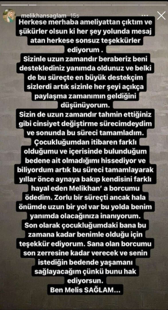 "Sizin de uzun zamandır tahmin ettiğiniz gibi cinsiyet değiştirme sürecimdeydim ve sonunda bu süreci tamamladım. Çocukluğumdan itibaren farklı olduğumu ve içerisinde bulunduğum bedene ait olmadığımı hissediyor ve biliyordum artık bu süreci tamamlayarak yıllar önce aynaya bakıp kendisini farklı hayal eden Melikhan'a borcumu ödedim"