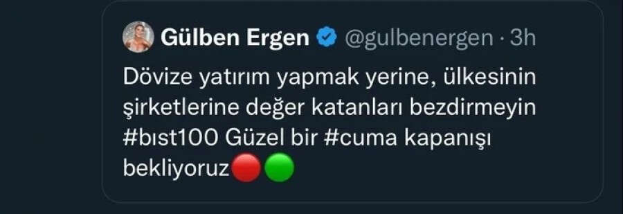 Borsayla yakından ilgilendiği bilinen Gülben Ergen, "Dövize yatırım yapmak yerine ülkesinin şirketlerine değer katanları bezdirmeyin, güzel bir cuma kapanışı bekliyoruz." diyerek yetkililere sesini duyurdu.