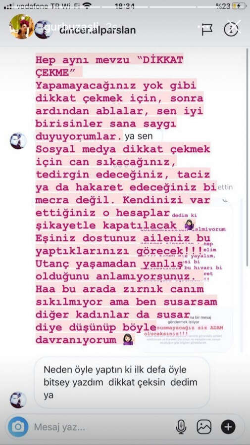Aslıhan Gürbüz, ''Biz susmayacağız siz adam olacaksınız'' dedi. İfşalandığını gördüğünde 'Dikkat çekmek için yazdım' diyen kişinin hadsizliğine tepki göstermeye devam eden oyuncu, ''Burası dikkat çekeceğiniz bir yer değil'' yazdı.