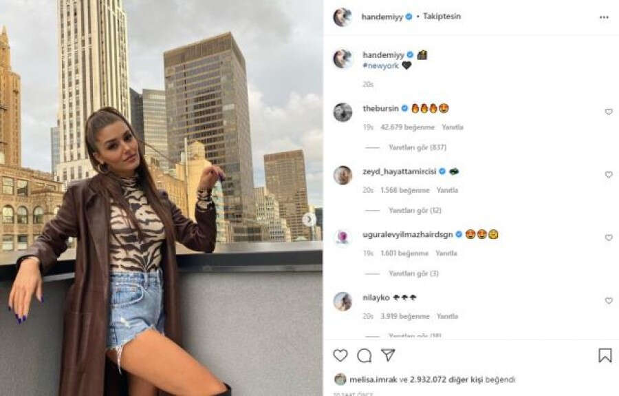 Güzel oyuncu geçtiğimiz günlerde ABD'ye gitti. Erçel, New York'ta çekilen fotoğraflarını Instagram'dan paylaştı. Erçel'in New York pozlarına, sevgilisi Kerem Bürsin de ateş emojisiyle yorum yaptı. Instagram'da 25 milyon takipçisi olan Hande Erçel'in paylaşıma saatler içinde 3 milyona yakın beğeni geldi.