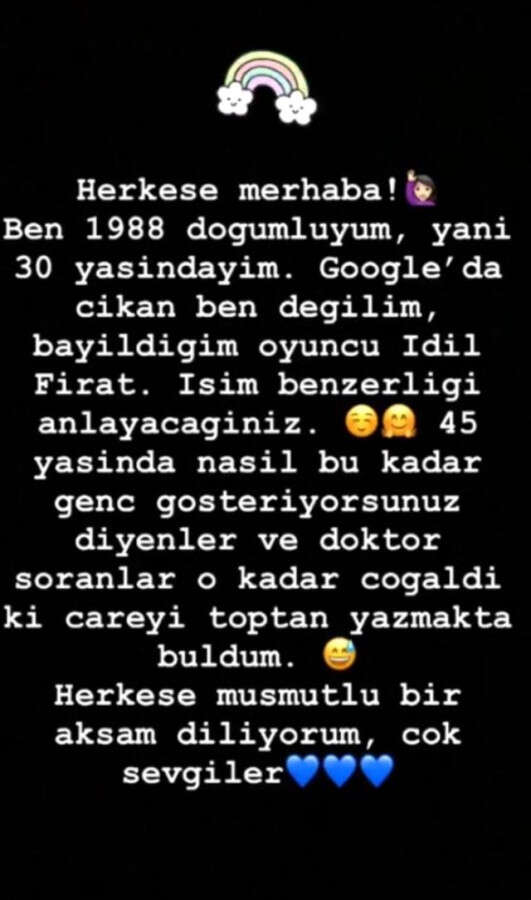 Mert Fırat ile evlendiği dönemde de yaşıyla ilgili eleştirilerin hedefi olan İdil Fırat, sosyal medyadan yayınladığı mesajla düzeltme yayınladı. İdik Fırat 'Google'da çıkan ben değilim' dedi.
