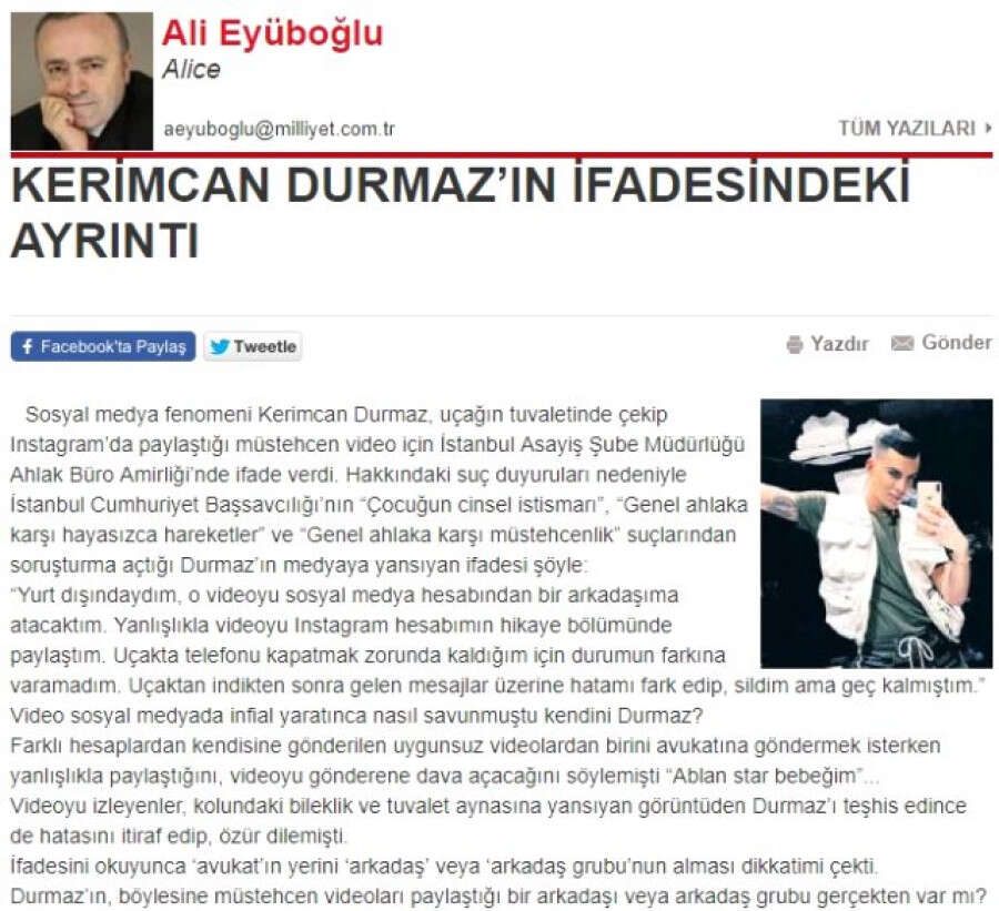 Uçak tuvaletindeki müstehcen görüntüsünü Intagram hesabından paylaşan ve hakkında suç duyurusunda bulunulan fenomen Kerimcan Durmaz, geçtiğimiz gün ifade verdi. Gazeteci Ali Eyüboğlu, Kerimcan'ın ifadesindeki arkadaş detayına dikkat çekerek köşesinde yazdı.