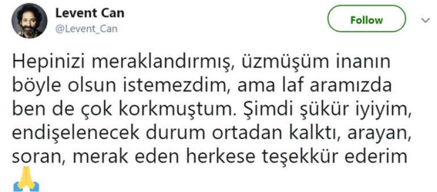 Sosyal medya hesabından bir açıklama yapan oyuncu " Hepinizi meraklandırmış, üzmüşüm inanın böyle olsun istemezdim, ama laf aramızda ben de çok korkmuştum. Şimdi şükür iyiyim, endişelenecek durum ortadan kalktı, arayan, soran, merak eden herkese teşekkür ederim" dedi.