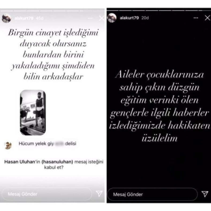 Bir fotoğrafına küfürlü yorum yapan takipçisine yanıt veren Alakurt şunları yazdı; "Bir gün cinayet işlediğimi duyacak olursanız bunlardan birini yakaladığımı şimdiden bilin. Aileler çocuklarınıza düzgün eğitim verin ki ölen gençlerle ilgili haberler izlediğimizde üzülelim."