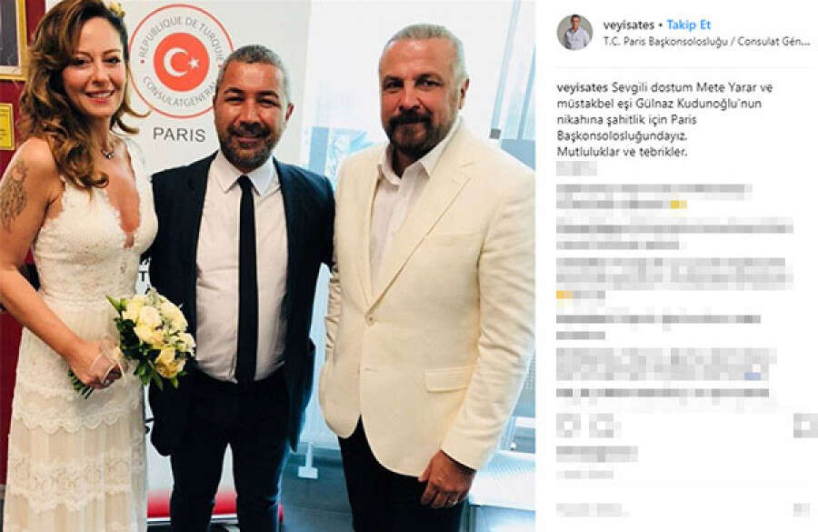 Instagram hesabından ikili ile çekilen fotoğrafını paylaşan Ateş, "Sevgili dostum Mete Yarar ve müstakbel eşine nikah şahitliği için Paris Başkonsolosluğumuzdayız. Mutluluklar ve tebrikler" ifadelerini kullandı.