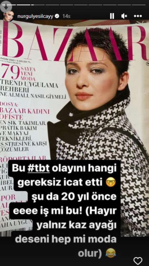 Instagram hesabından yaptığı paylaşımlarla sık sık adından söz ettiren Yeşilçay önce 12 yıl önce bir dergiye verdiği pozu paylaşarak "Şunu çekeli 12 yıl olmuş, olamaz ama aaa. Yok bir daha TBT falan. Önümüze bakıyoruz" notunu yazdı. Yeşilçay daha sonra da 20 sene önce çektirdiği bir fotoğrafı yayınlayarak "Bu TBT olayını hangi gereksiz icat etti. Şu da 20 yıl önce ee bu iş mi bu! Hayır yalnız kaz ayağı deseni hep mi moda olur" dedi.