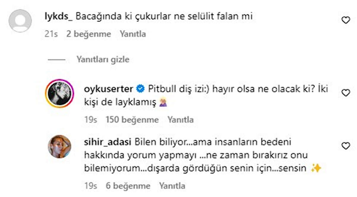 Instagram'da bir takipçisi Öykü Serter'e bacağındaki iz için, "Selülit mi?" diye sordu.