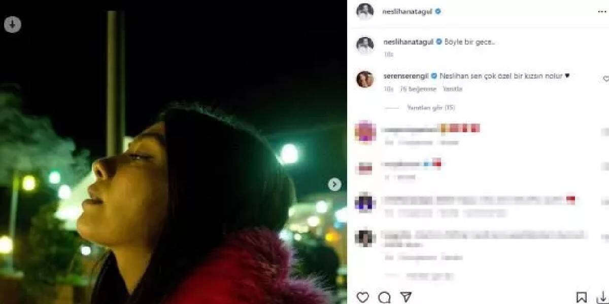 Neslihan Atagül resmi Instagram hesabı üzerinden kendi fotoğrafını paylaşarak "Böyle bir gece" notunu ekledi. Geçtiğimiz günlerde yaptığı açıklamalarla gündeme gelen Seren Serengil'in Neslihan Atagül'ün ihanete uğradı iddialarına ortaya attı. Neslihan Atagül'ün paylaşımı üzerine Seren Serengil de sessizliğini bozdu. Serengil, Atagül’ün paylaşımına "Neslihan sen çok özel bir kızsın ne olur" yorumunu yaptı.
