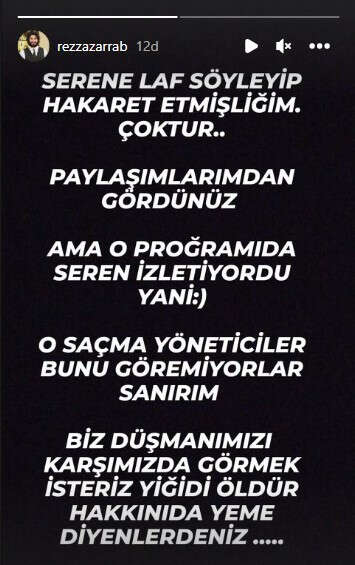 Zarrab ise can düşmanı Serengil için, "O programı Seren izlettiriyordu. Yiğidi öldür hakkını yeme" paylaşımı yaparak herkesi şaşırttı.