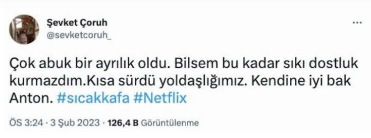 ‘Bilseydim bu kadar sıkı dostluk kurmazdım’ diyen Çoruh, ‘İkinci sezon şimdi yok mu?’ diyen bir kullanıcısına da ‘Yok’ yanıtını verirken, Netflix’ten konuya ilişkin herhangi bir açıklama yapılmadı.