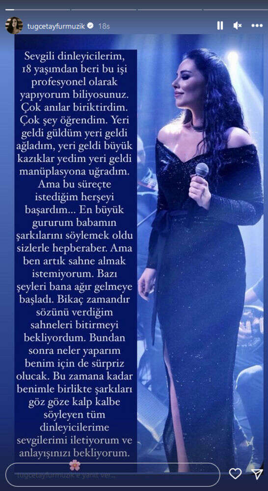 Sevgili dinleyicilerim, 18 yaşından beri bu işi profesyonel olarak yapıyorum biliyorsunuz ki... Çok anılar biriktirdim. Çok şey öğrendim. Yeri geldi güldüm. Yeri geldi ağladım, yeri geldi büyük kazıklar yedim, yeri geldi manipülasyona uğradım ama bu süreçte istediğim her şeyi başardım... En büyük gururum babamın şarkılarını sizlerle birlikte hep bir ağızdan söylemek oldu. Ama ben artık sahne almak istemiyorum. Bu işin bazı şeyleri bana ağır gelmeye başladı. Birkaç zamandır sözünü verdiğim sahneleri bitirmeyi bekliyordum. Bundan sonra neler yaparım benim için de sürpriz olacak. Bu zamana kadar benimle birlikte şarkıları göz göze, kalp kalbe söyleyen tüm dinleyicilerime sevgilerimi iletiyorum ve anlayışınızı bekliyorum.