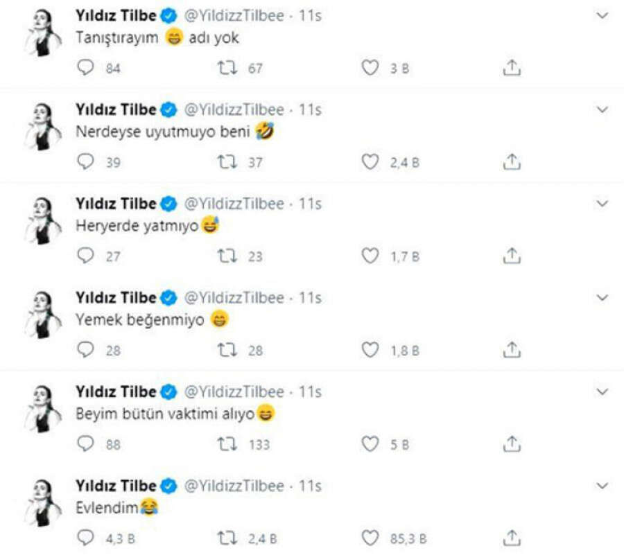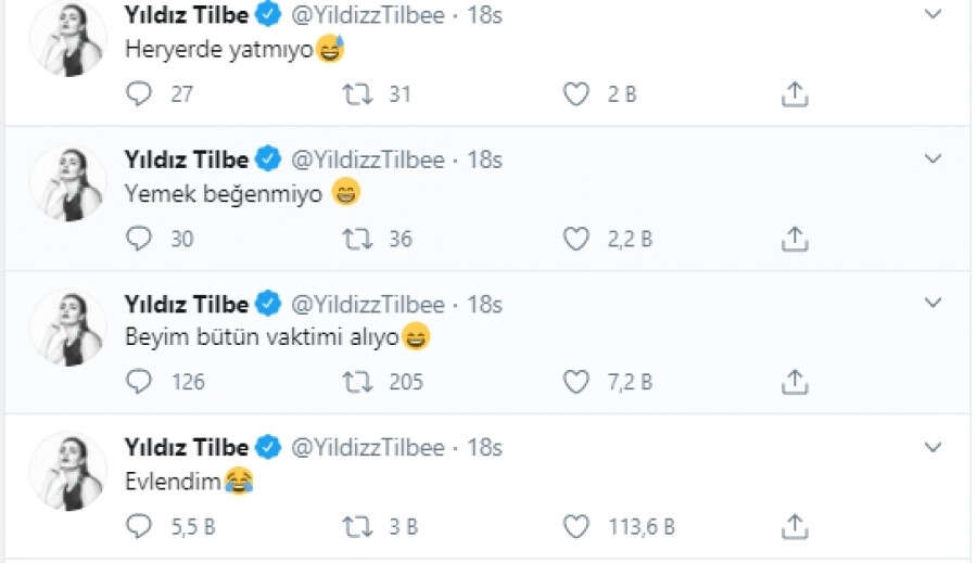 Twitter'da ilk olarak ''Evlendim'' diyen Tilbe ardından da ''Beyim bütün vaktimi alıyor'' paylaşımı yaptı ve paylaşımları art arda devam etti.
