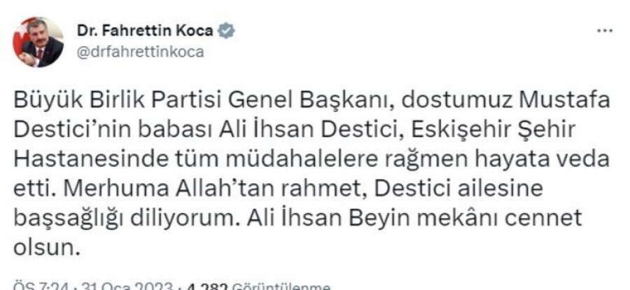 Sosyal medya hesabından açıklama yapan Sağlık Bakanı Fahrettin Koca, "Büyük Birlik Partisi Genel Başkanı, dostumuz Mustafa Destici'nin babası Ali İhsan Destici, Eskişehir Şehir Hastanesinde tüm müdahalelere rağmen hayata veda etti. Merhuma Allah'tan rahmet, Destici ailesine başsağlığı diliyorum. Ali İhsan Beyin mekânı cennet olsun." ifadelerini kullandı.